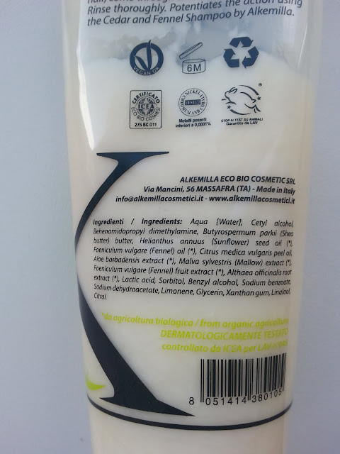 Ingredienti: Aqua [Water], Cetyl alcohol, Behenamidopropyl dimethylamine, Butyrospermum parkii (Shea butter) butter (*), Helianthus annuus (Sunflower) seed oil (*), Foeniculum vulgare (Fennel) oil (*), Aloe barbadensis extract (*), Citrus medica vulgaris peel oil, Malva sylvestris (Mallow) extract (*), Foeniculum vulgare (Fennel) fruit extract (*), Althaea officinalis root extract (*), Lactic acid, Sorbitol, Benzyl alcohol, Sodium benzoate, Sodium dehydroacetate, Limonene, Glycerin, Xanthan gum, Linalool, Citral.